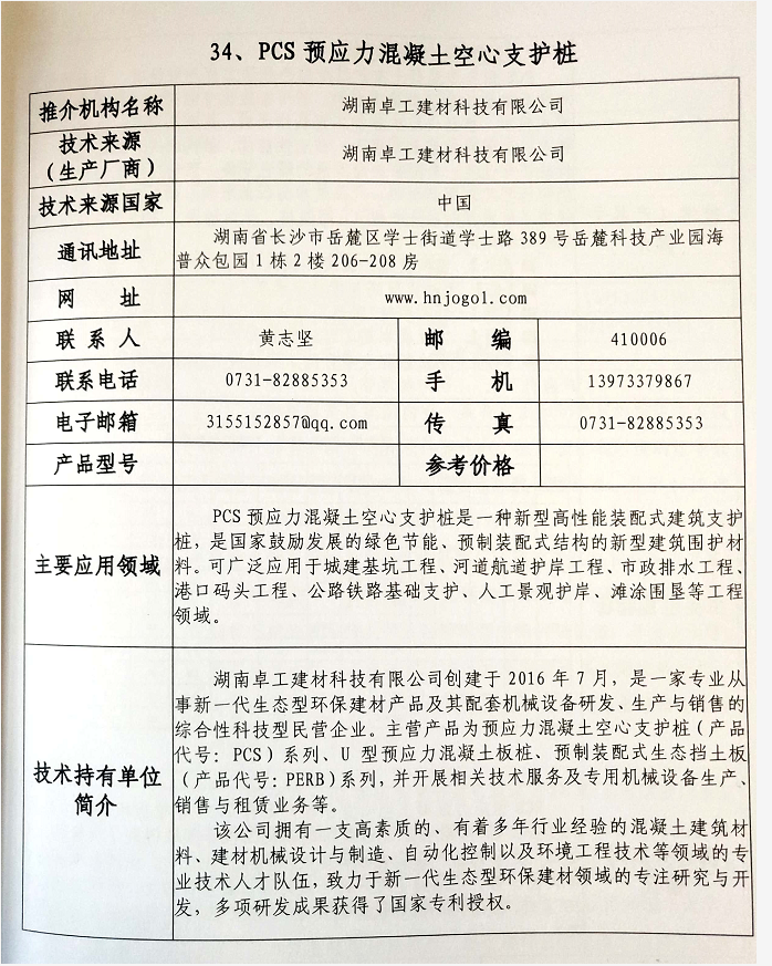 祝賀我司“新一代高性能預制裝配式建筑支護樁”產品被評選為湖南省水利先進實用技術產品,被錄入《湖南省2019年度水利先進實用技術(產品)推廣名錄》。